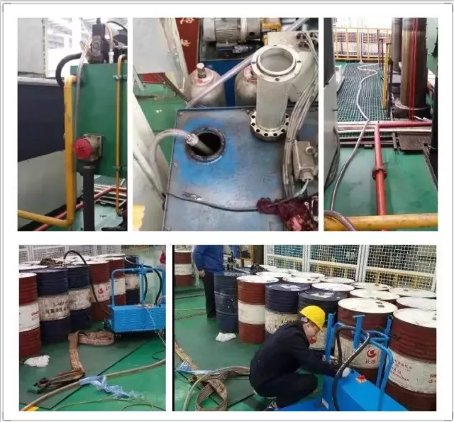 海特服務組進場,調取裝油空桶32只,安排抽油機管線,對壓機主油箱和頂部泄壓油箱進行抽油,共計抽29桶,根據抽油部位對所抽舊油做登記分類存放。