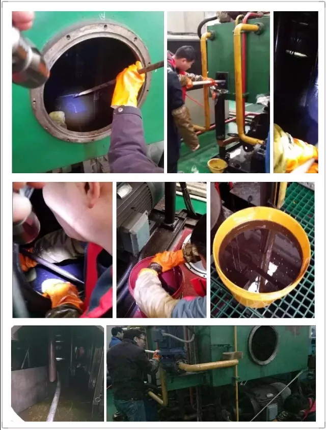 其內高壓成型車間有南通鍛造生產的3000T液壓成型機一臺,因使用國產某品牌46#液壓油長期未進行油品、設備系統清潔,箱體內存有大量油垢,油液底部輕度乳化,設備在運行過程中經常出現升壓反應慢、壓力鎖緊裝置動作卡滯和主泵噪音大的狀況。基于此情況我司在提供殼牌海得力46#抗磨液壓油的同時,提供液壓系統清潔維護服務,對設備油箱、管線、濾網等裝置進行清污保養。